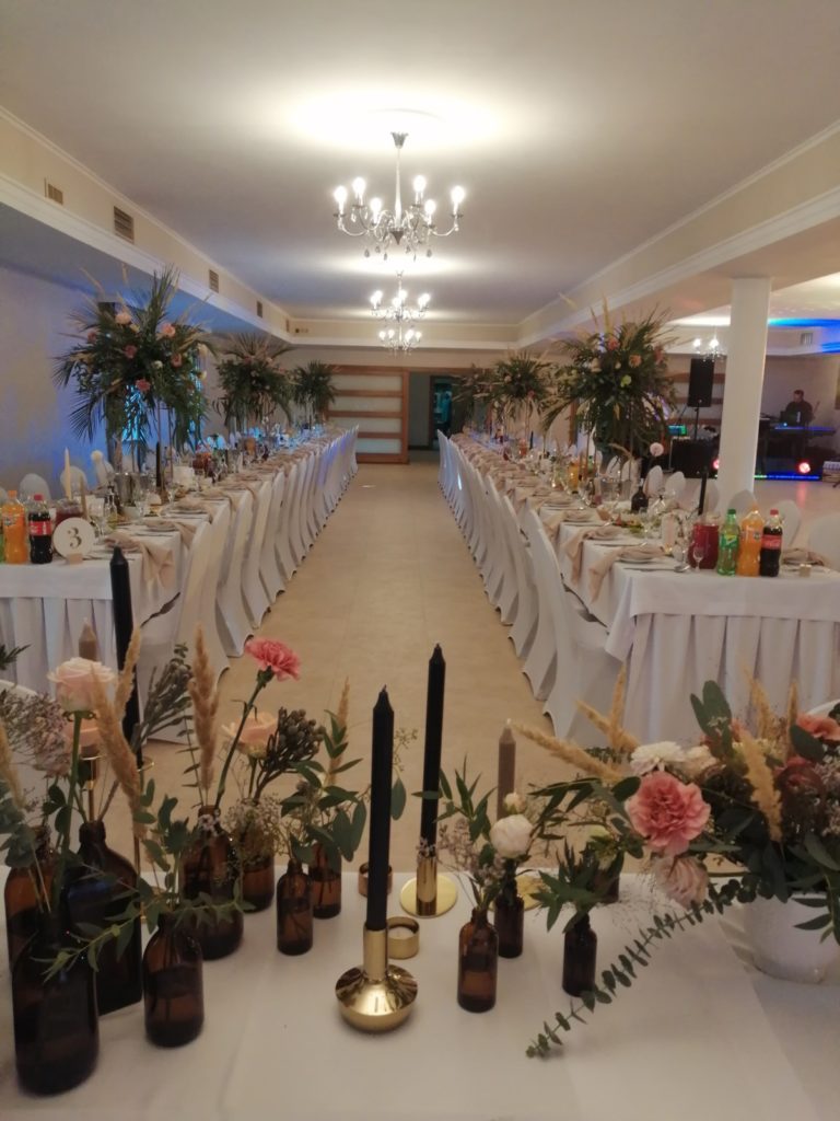 Proponujemy Państwu Salę balową o powierzchni 320m2, która pomieści 240 gości. Sala restauracyjno-bankietowa o powierzchni 150m2 jest w stanie pomieścić 80 gości. W połączeniu obu sal obiekt może zagwarantować miejsce dla 320 osób.